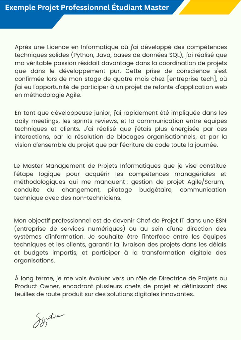 Le projet professionnel, lui, explique le métier que vous souhaitez exercer après vos études et votre évolution à 5–10 ans.